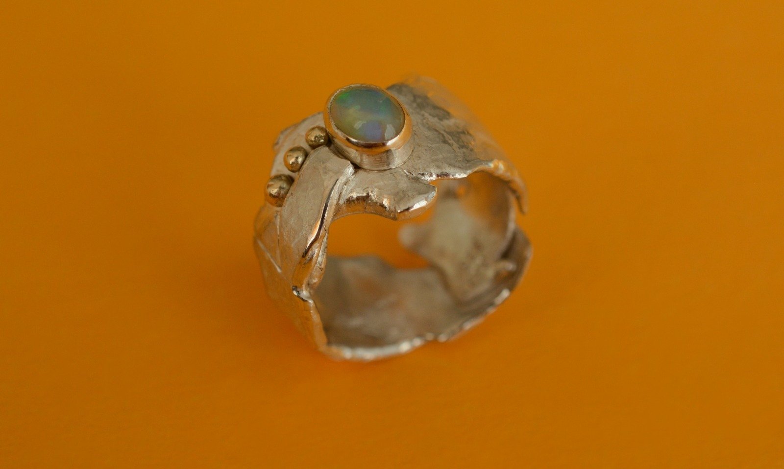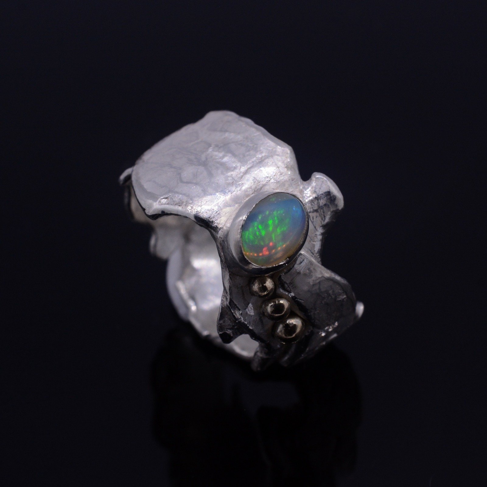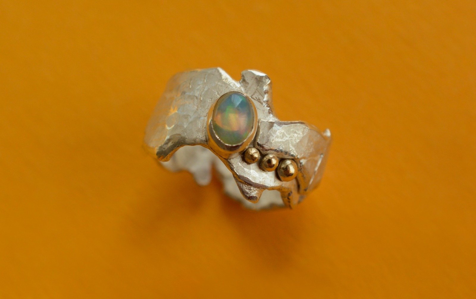 Mountain Lake sterling silver ring with yellow gold drops and gorgeous Ethiopian opal. The ring is hammered and textured to bring out more radiance. Creative and unique design inspired by the magic and beauty of the Swiss mountains make this ring a great statement jewellery piece.
