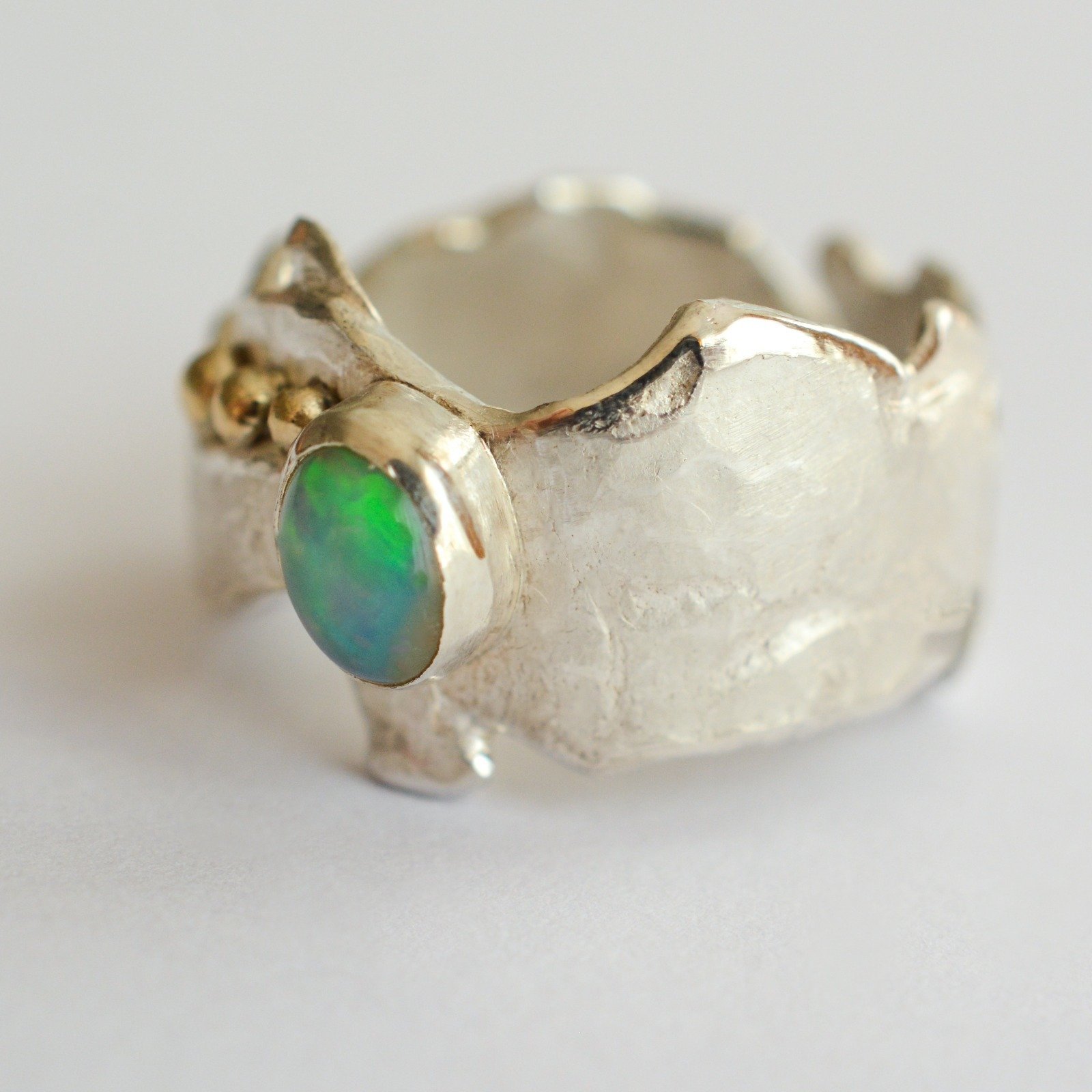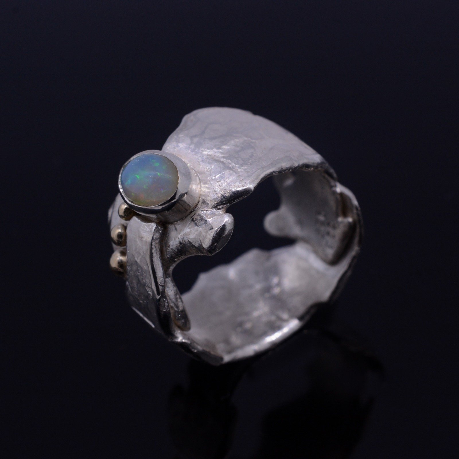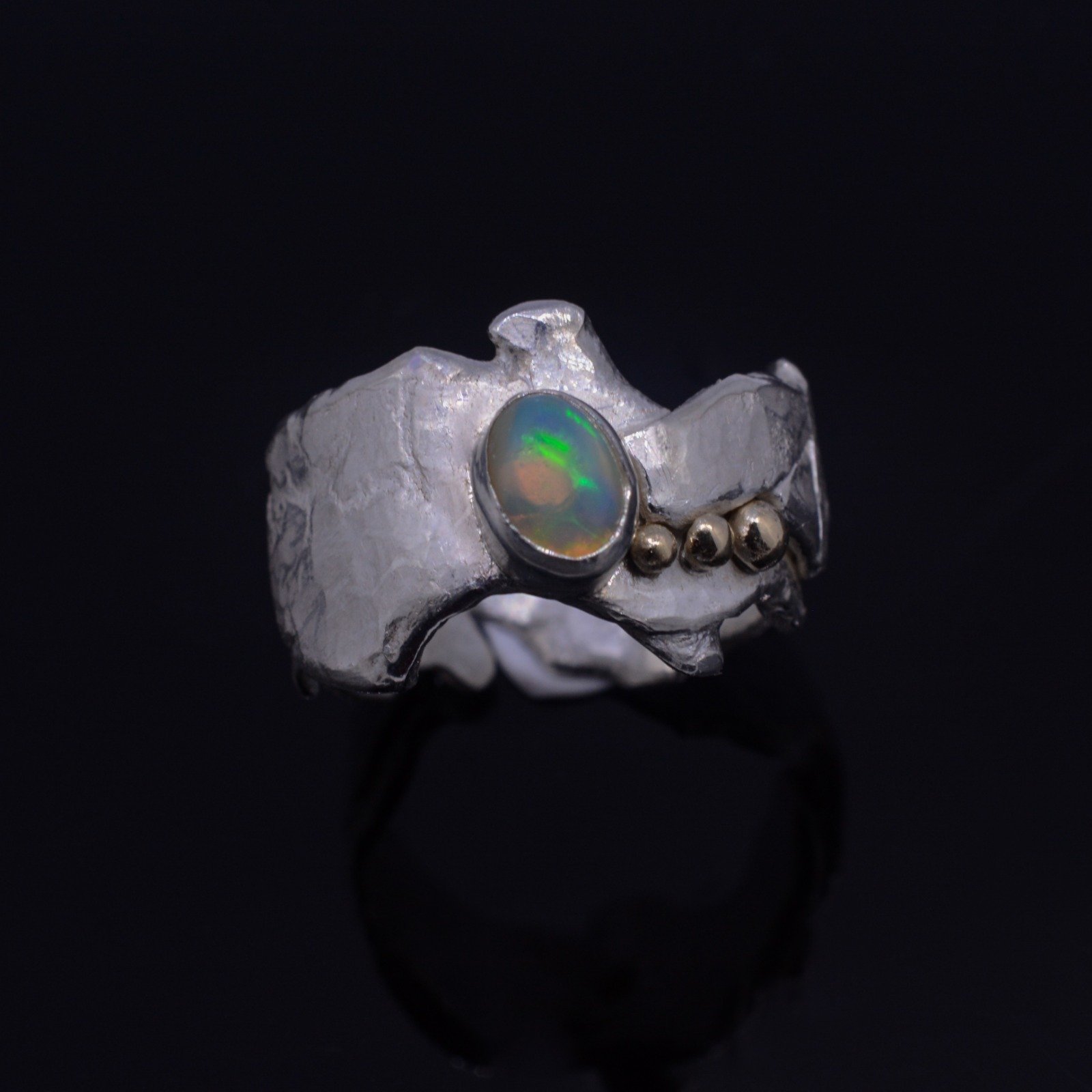 Mountain Lake sterling silver ring with yellow gold drops and gorgeous Ethiopian opal. The ring is hammered and textured to bring out more radiance. Creative and unique design inspired by the magic and beauty of the Swiss mountains make this ring a great statement jewellery piece.