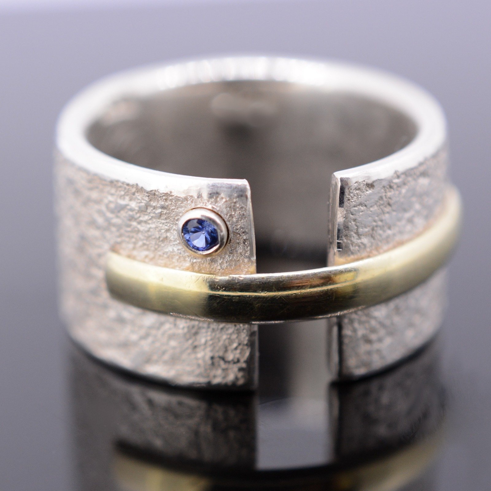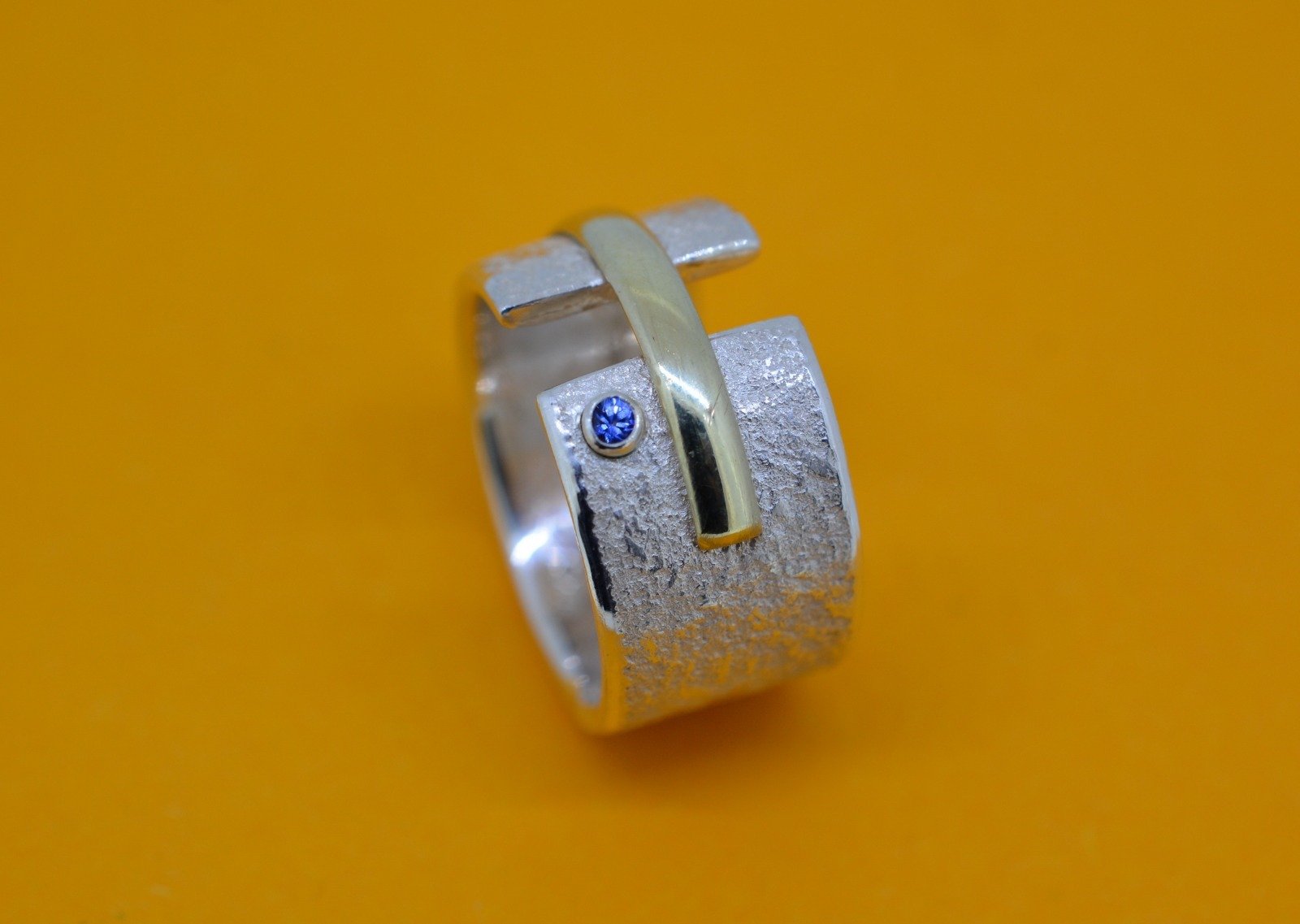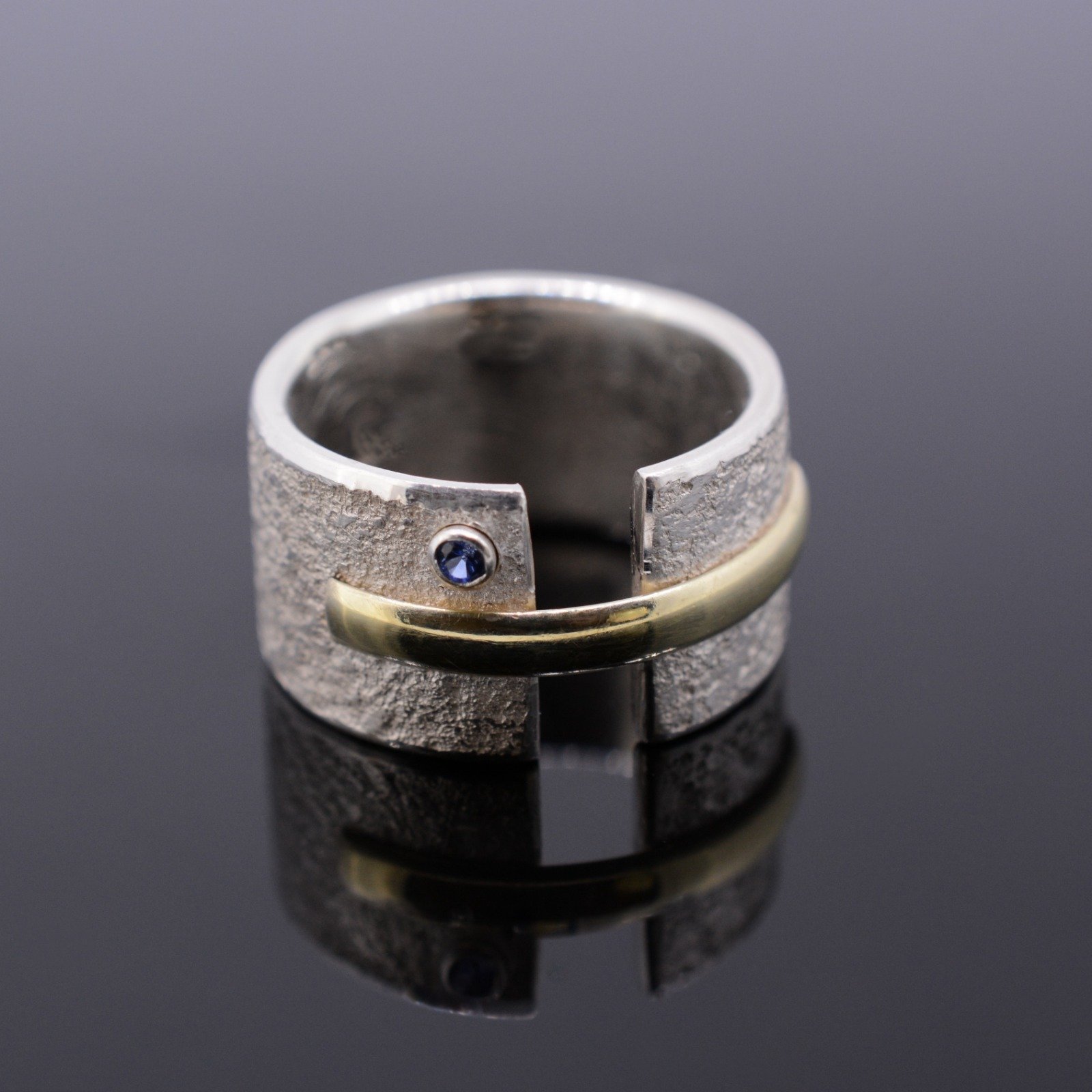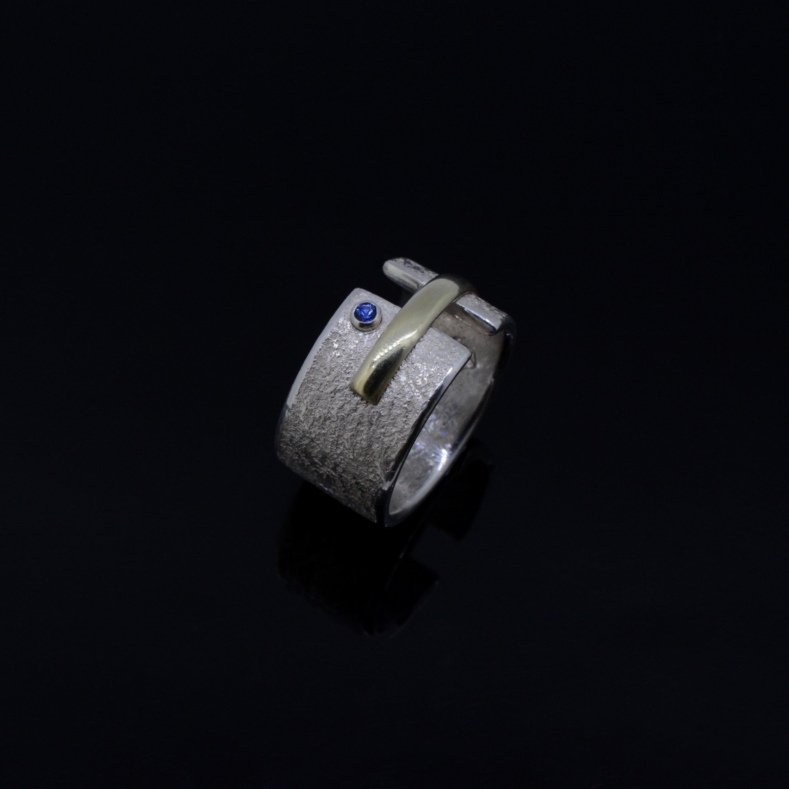 Pac Man solid sterling silver ring with yellow gold horizontal bar and gorgeous deep blue sapphire. The ring is hammered and textured to bring out more radiance.