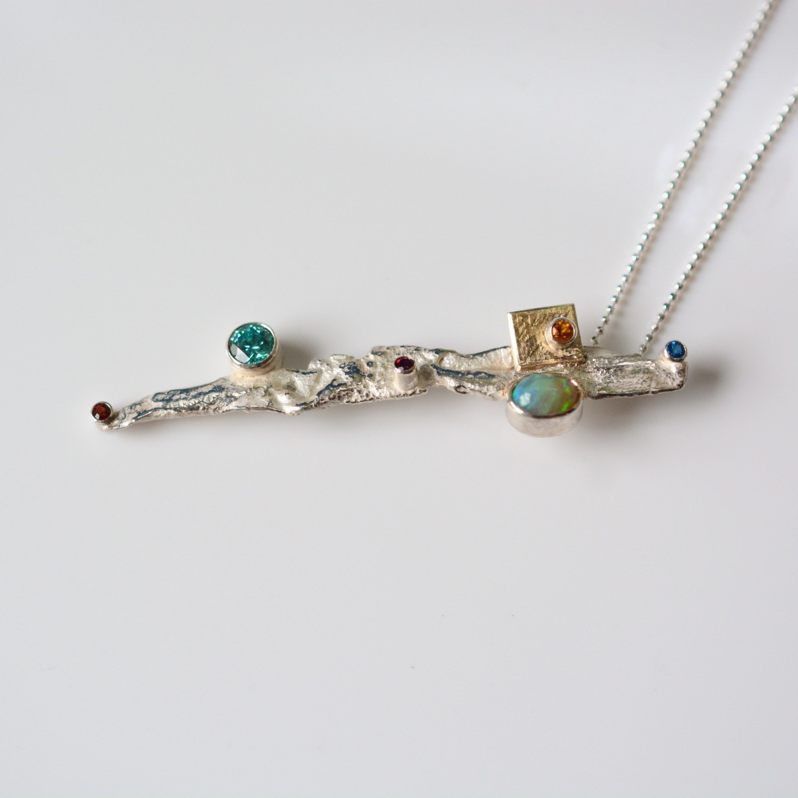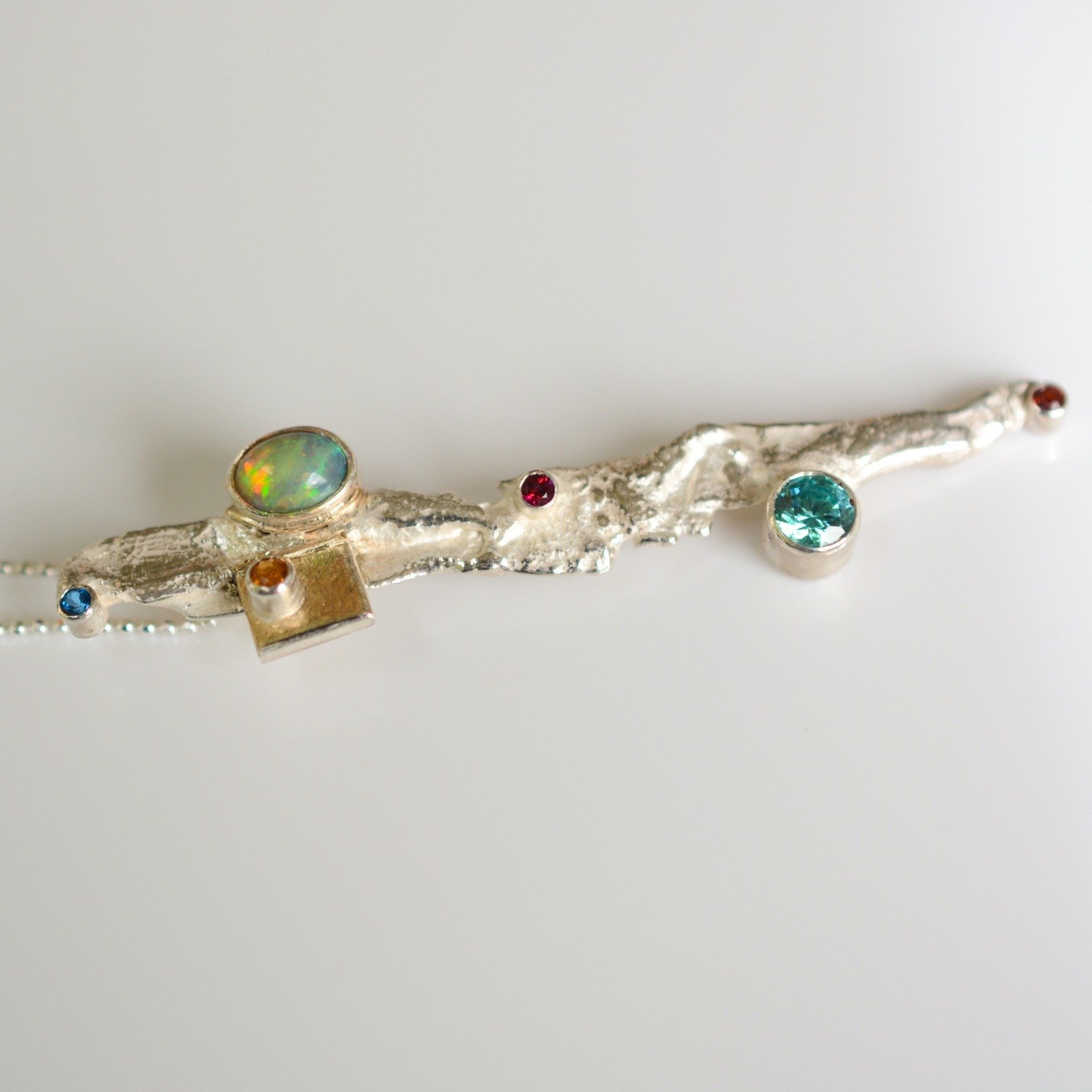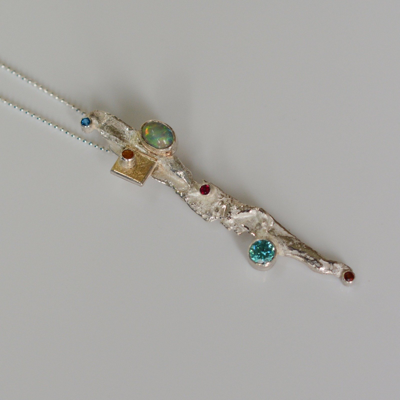 Treasure Island sterling silver pendant with gold square element, Ethiopian opal, citrine,Mint zirconia, rhodolite, Blazing Red and Kashmir topaz gemstones. What a combination of sparkle and beauty! This unique, sparkling from every angle statement pendant comes together with a sterling silver 400mm diamond cut chain.