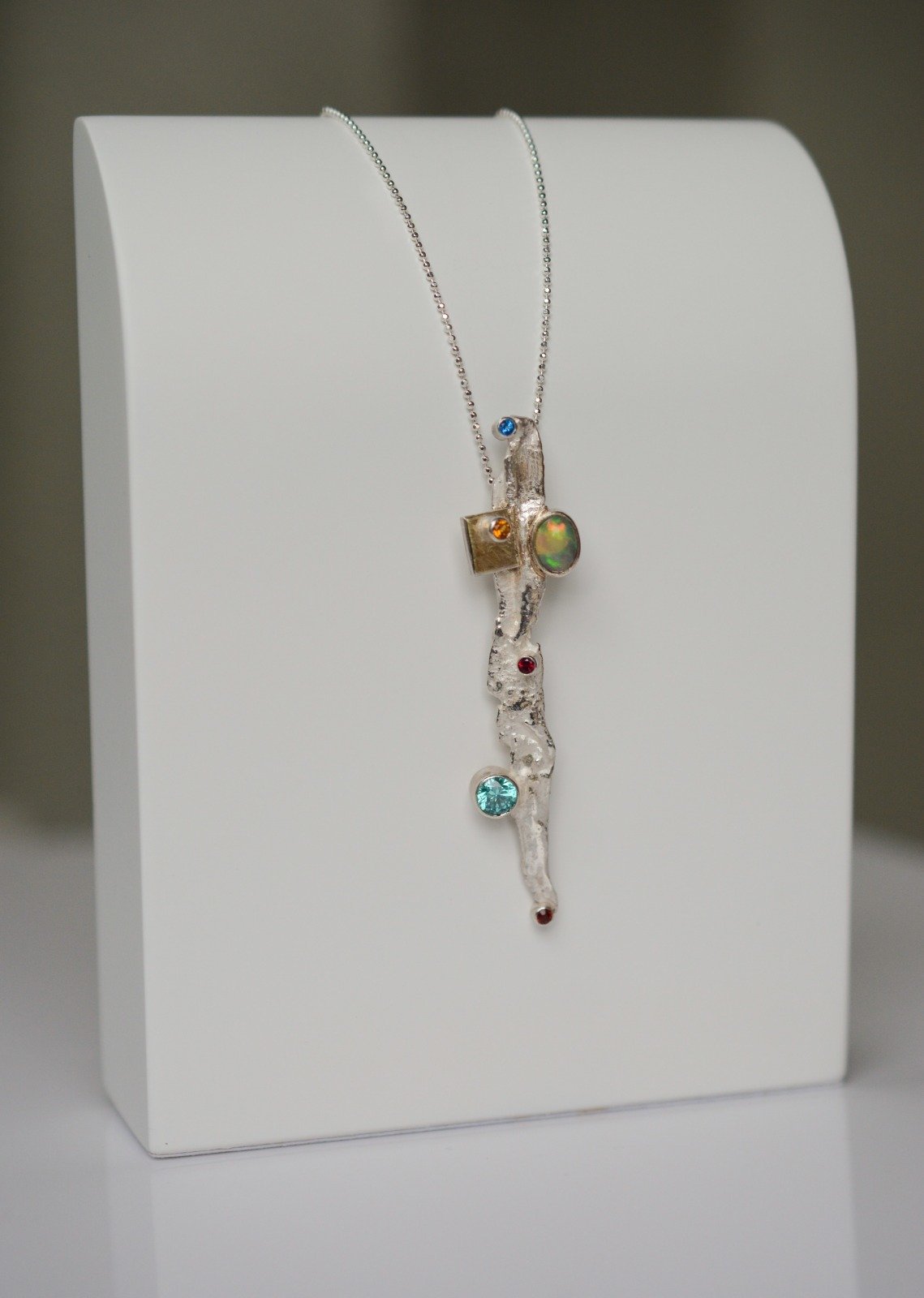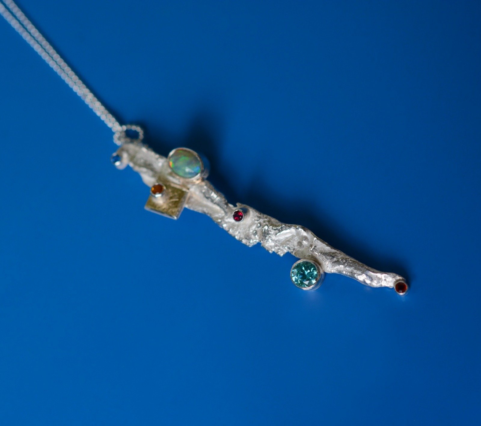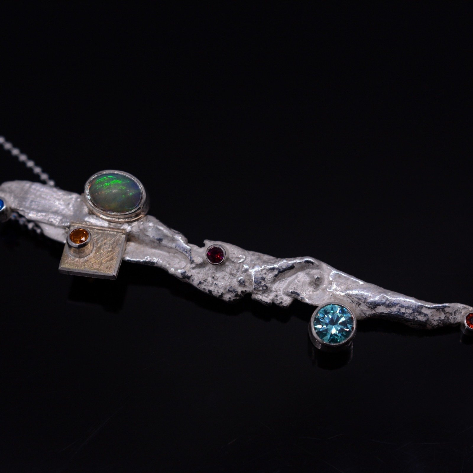 Treasure Island sterling silver pendant with gold square element, Ethiopian opal, citrine,Mint zirconia, rhodolite, Blazing Red and Kashmir topaz gemstones. What a combination of sparkle and beauty! This unique, sparkling from every angle statement pendant comes together with a sterling silver 400mm diamond cut chain.