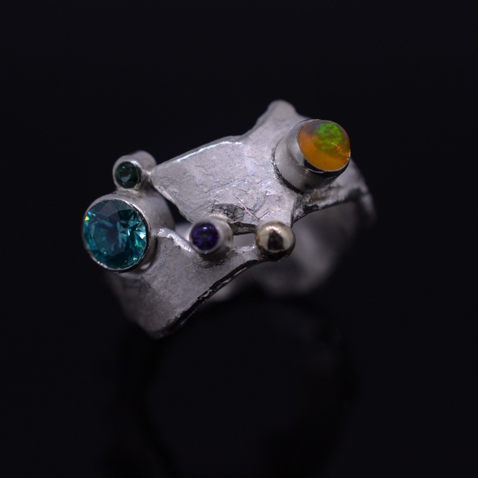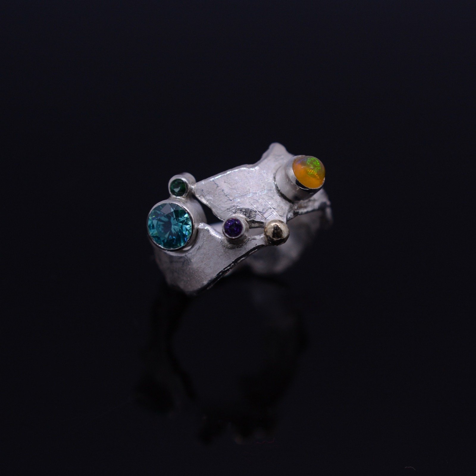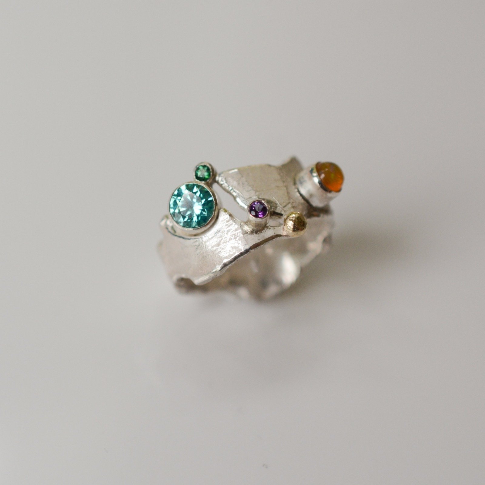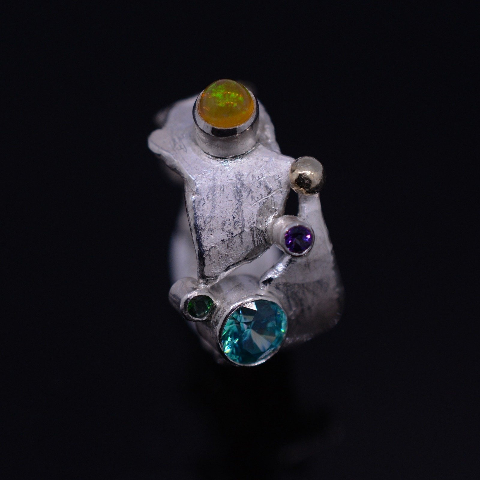 Treasure Ring sterling silver small pinky ring with the gold drop, Ethiopian opal, Mint zirconia, topaz Violac and Forest Rainbow green topaz gemstone.