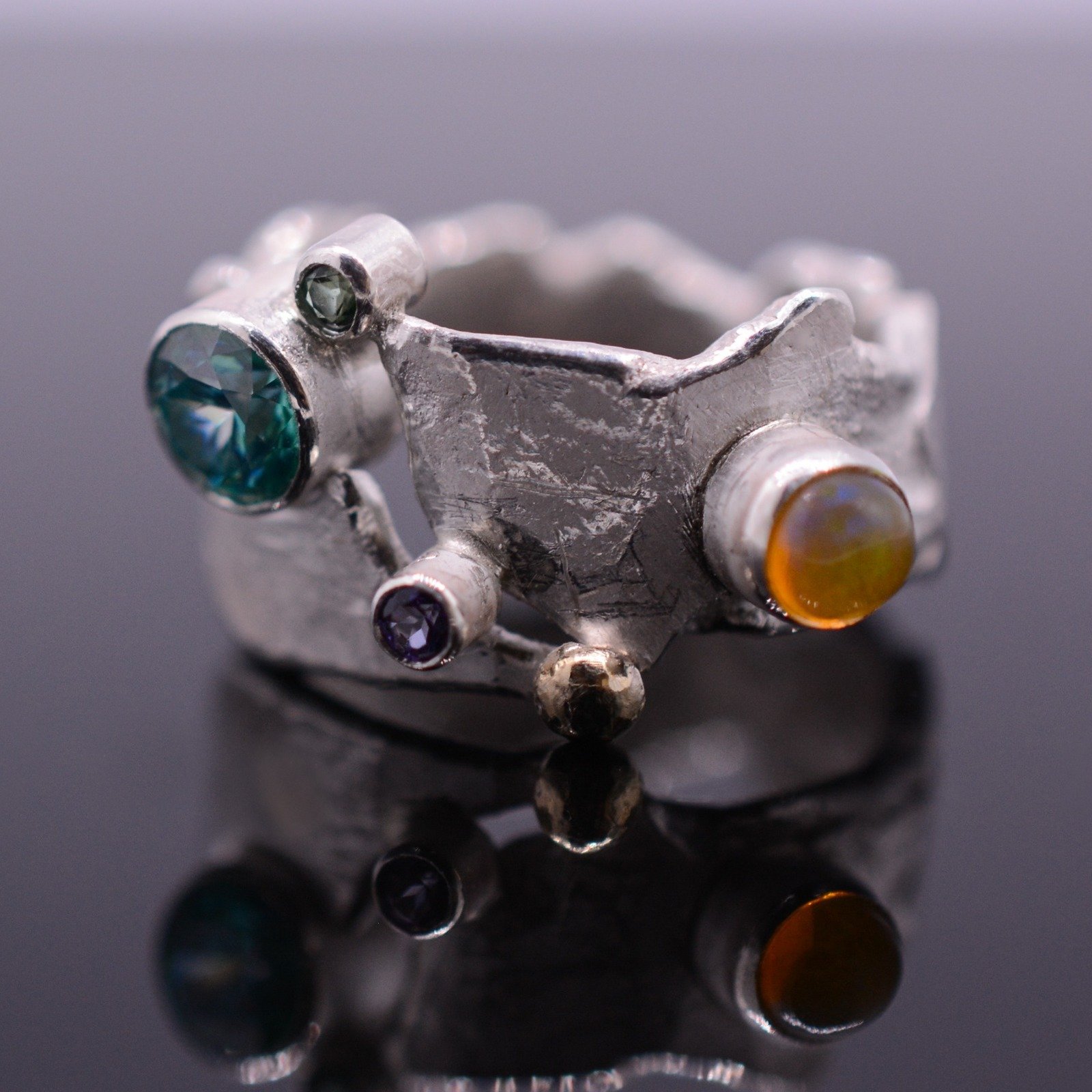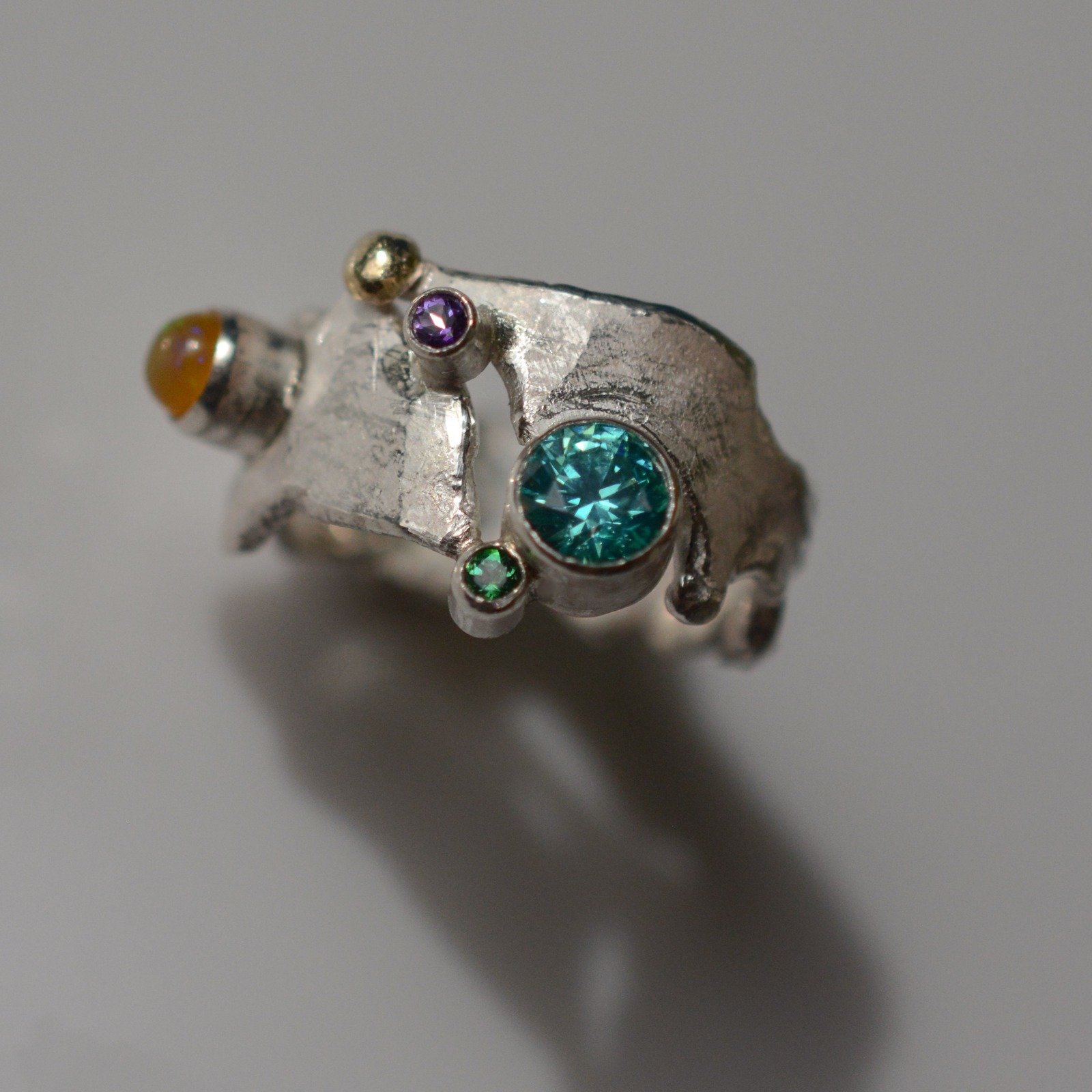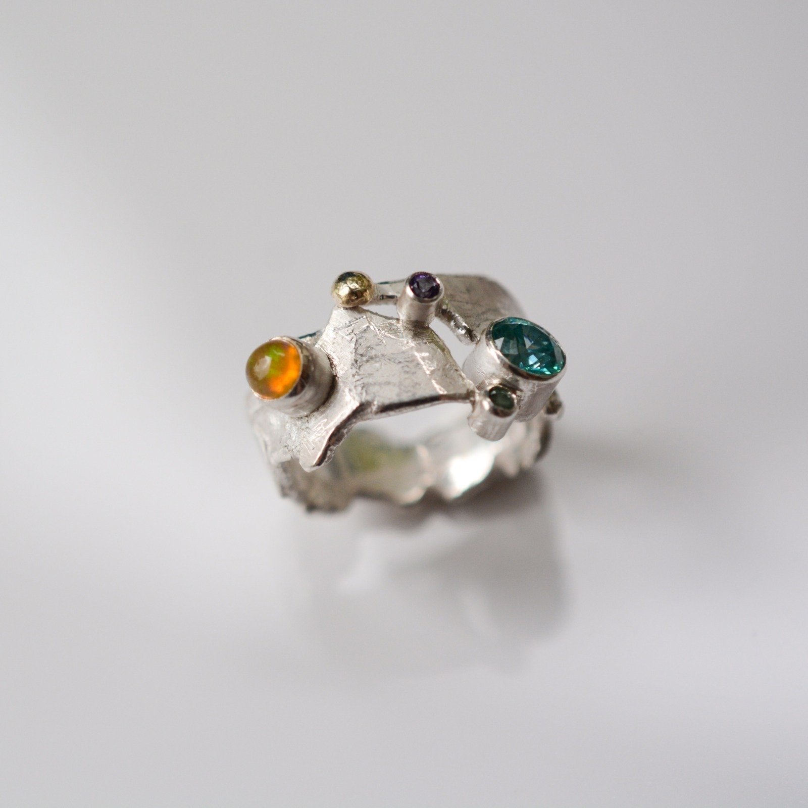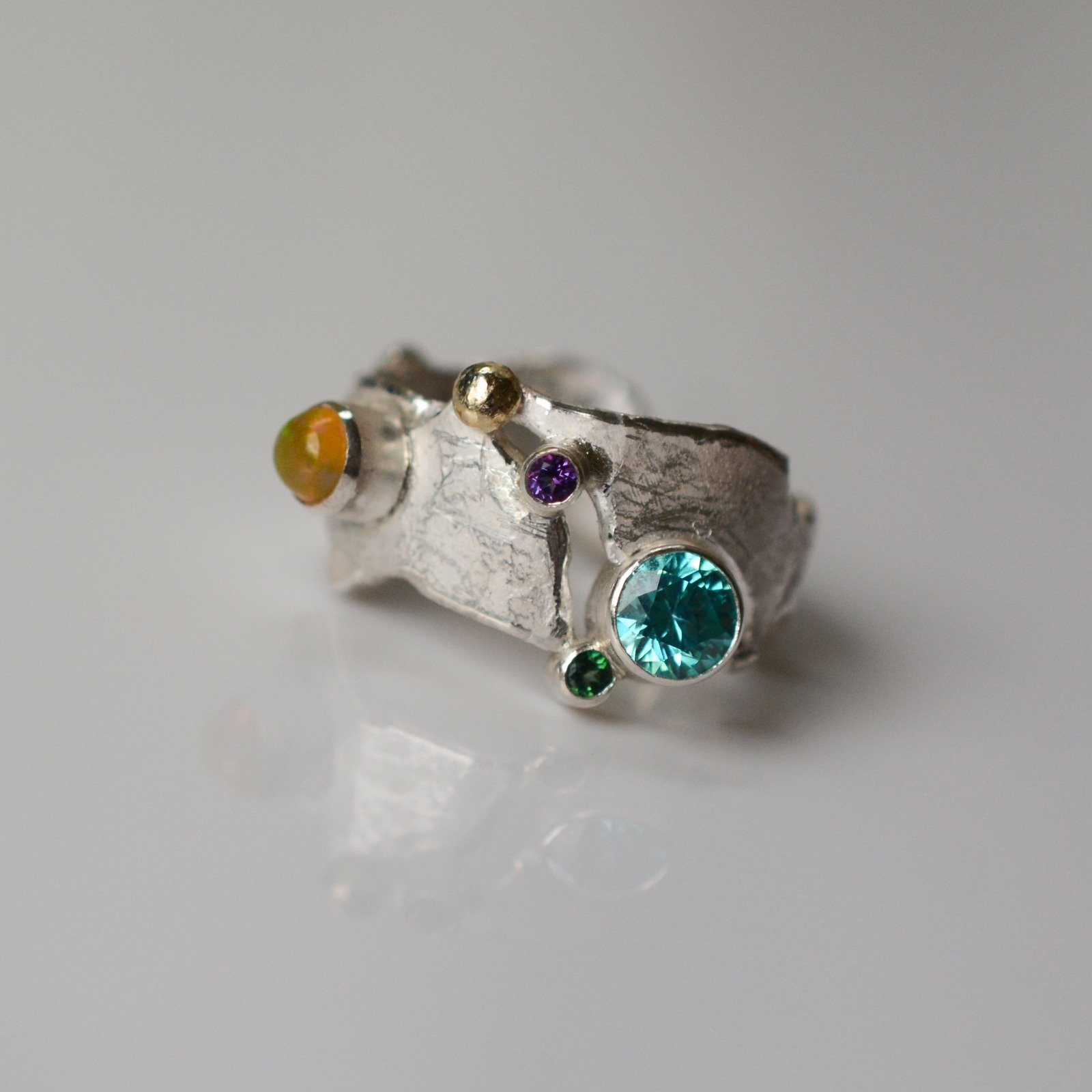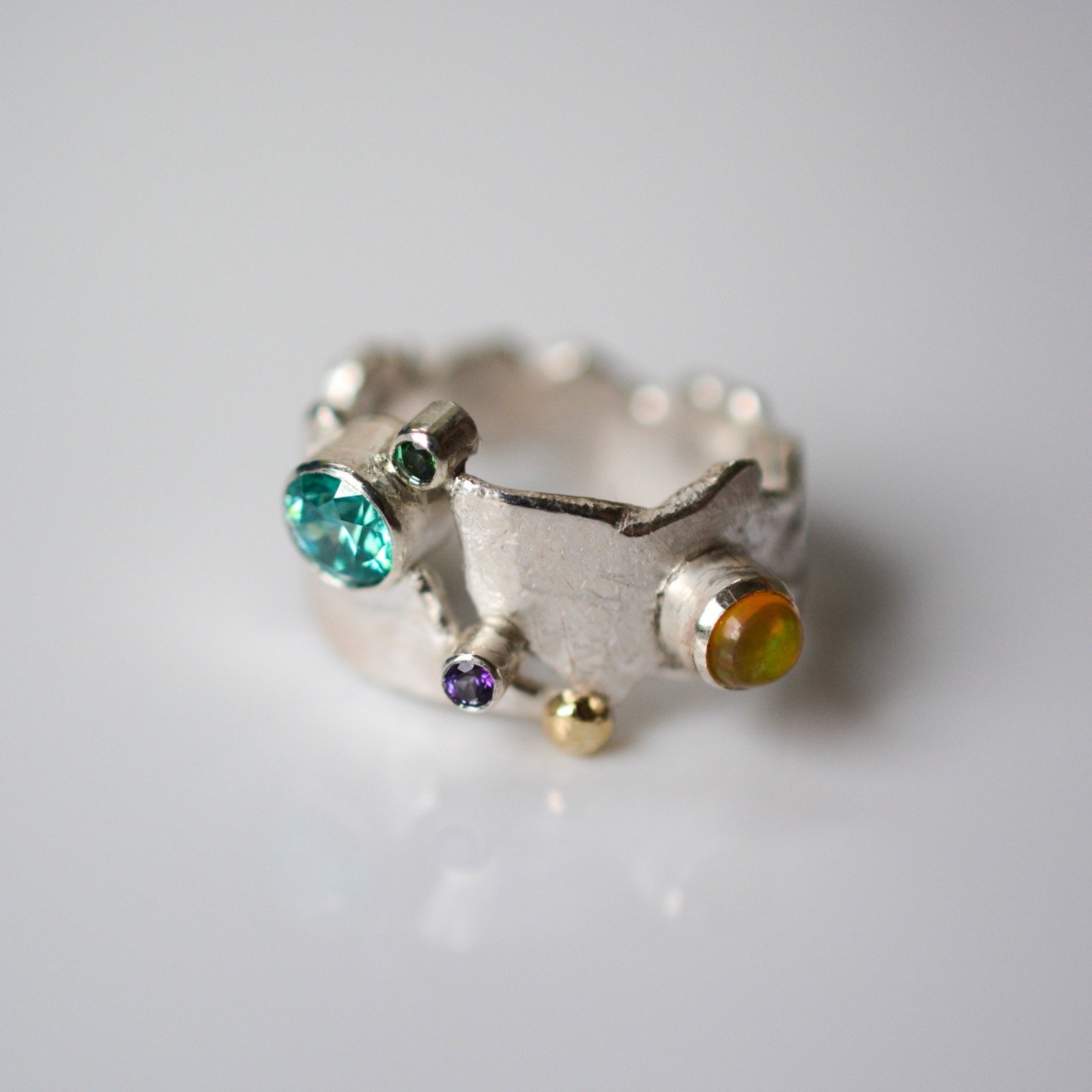 Treasure Ring sterling silver small pinky ring with the gold drop, Ethiopian opal, Mint zirconia, topaz Violac and Forest Rainbow green topaz gemstone.